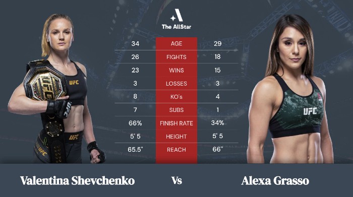 La actual campeona del peso mosca de la UFC, Valentina «The Bullet» Shevchenko, defenderá su título de las 125 libras ante la aspirante Alexa Grasso.