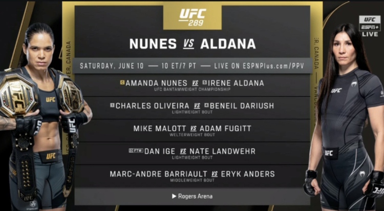 UFC 289: El evento principal verá a Amanda Nunes regresar al octágono este fin de semana para defender su cinturón del peso gallo contra la mexicana Irene Aldana. La que se suponía que iba a ser la trilogía más importante de la historia de las MMA femeninas se ha pospuesto debido a la lesión de Julianna Pena, que se fracturó varias costillas durante el campo de entrenamiento.