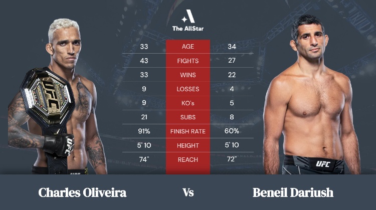 En nuestra opinión en apuestasufc.net Dariush es el verdadero favorito, viene de un excelente momento ascendente (8 victorias consecutivas), combate tras combate ha demostrado que es el verdadero aspirante al título. Estilísticamente, podría ser el verdadero anti-Makhachev, gracias a su excelente gestión del combate. Puede que Oliveira ya haya agotado su ciclo, con Makhachev demostró un sufrimiento en el manejo de la presión en el grappling, un factor que Dariush probablemente intentará recuperar.
